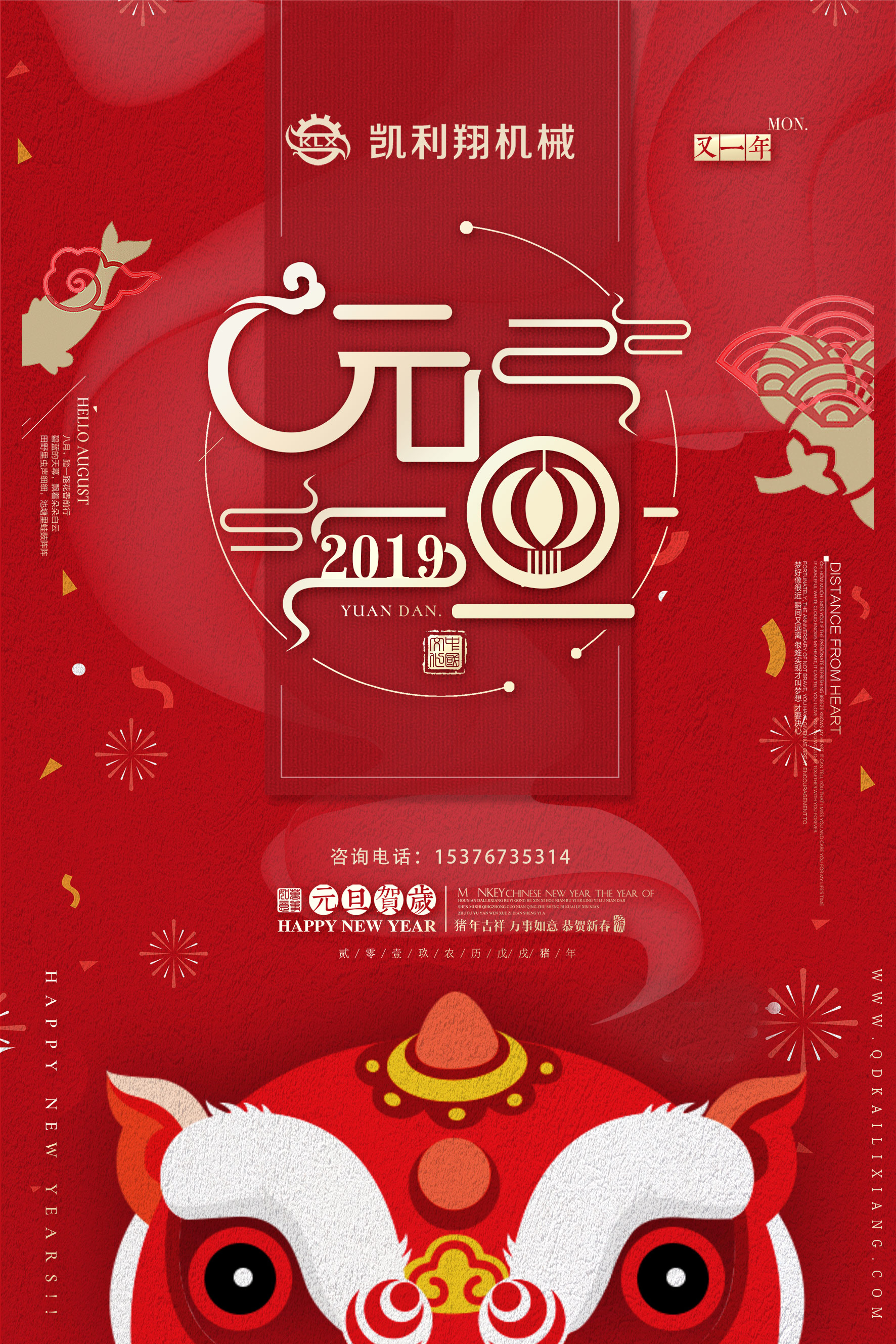 一春一夏一秋冬,我們迎來(lái)了一個(gè)充滿希望的2019年,值此佳節(jié)之際,謹(jǐn)代表青島凱利翔機(jī)械設(shè)備有限公司的全體員工,向所有的新老客戶表示衷心的感謝,祝愿大家在2019年里,心想事成,工作順利,闔家歡樂(lè)!過(guò)去的一年,我們共同經(jīng)歷了風(fēng)風(fēng)雨雨,正是因?yàn)橛辛四闹С峙c信任,我們才能得到如今的碩果,在即將到來(lái)的2019年里,我們由衷的期待與您的進(jìn)一步合作,攜手再創(chuàng)一個(gè)豐收的2019!在接下來(lái)的2019年里,我們會(huì)更加的努力,更加的奮進(jìn),我們堅(jiān)信,我們的努力會(huì)打造一份不一樣的天空!